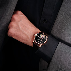 Новая модель Classic Tourbillon Manufacture 2023года обладает более изысканным дизайном. Вместо апертуры турбийона в форме "запятой", характерной для этих модели с 2008 года, новая версия представляет собой идеальный круг. Лаконичность циферблата подчеркнута тщательно отполированными накладными индексами и золотыми стрелками. Тонкие и удлиненные, они словно парят над угольно-серым циферблатом, который украшен узором «солнечные лучи». Classic Tourbillon Manufacture 2023 года поставляются на темно-коричневом матовом кожаном ремешке с раскладывающейся застежкой, которая украшена гербом Frederique Constant.
