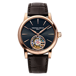 Дизайн Classic отражает традиционное швейцарское производство часовых механизмов, возведенное в главный принцип развития компании Frederique Constant. Турбийон в 39-мм корпусе из 18-каратного розового золота, выпущен ограниченной серией в 150 экземпляров. Турбийон величественно размещен в положении "6 часов" и является великолепным образцом высокого часового мастерства. Этот механизм, с кремниевым спусковым колесом и рычагом, обеспечивает высокую точность часов, нечувствительную к магнитным полям и перепадам температуры. Секундная стрелка, парящая над кареткой, состоит из 81 компонента. Она имеет индивидуальную гравировку с серийным номером каждого экземпляра. Механизм, с отделкой в лучших традициях часового искусства, обеспечивает запас хода 38 часов.