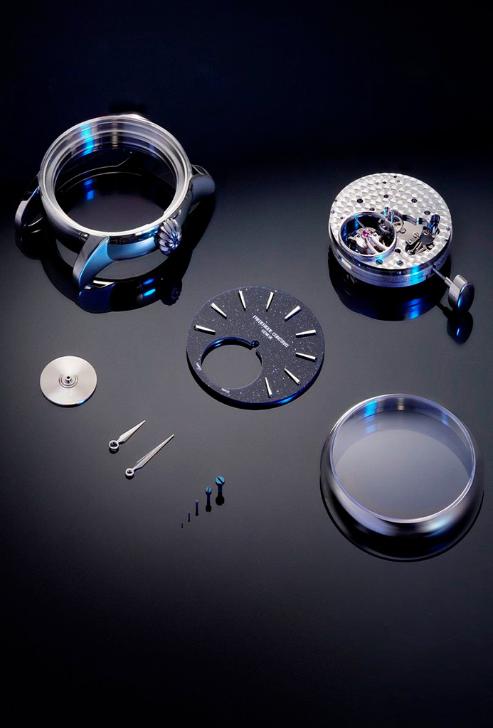 Корпус диаметром 39 мм выполнен из 18-каратного белого золота, подчёркивающего утончённость и статус их владельца. Авантюриновый циферблат, созданный вручную, символизирует бесконечность звёздного неба и делает каждый экземпляр уникальным.