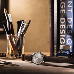 В отсутствии секундных стрелок нет ничего, что отличало бы этот классический кварц эстетически от механических часов. Действительно, есть и более тонкие сходства благодаря высокому уровню отделки: полированный корпус, накладные часовые метки, удвоенные в положении «12 часов», и вышитый нубук – кожаный ремешок или трехзвенный стальной браслет.