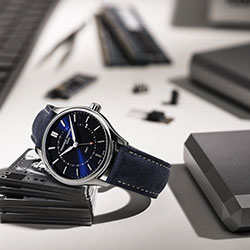 Считающаяся одним из основных материалов в часовом деле, сталь украшает четыре корпуса диаметром 40 мм, пятый покрыт розовым золотом с воронеными стальными стрелками. Каждая вариация оснащена автоматическим калибром FC-303 с запасом хода 38 часов и дополнена кожаным ремешком из нубука коричневого, черного или синего цвета. Среди исключения – модель full steel, которая имеет синий циферблат и координирующий стальной браслет.