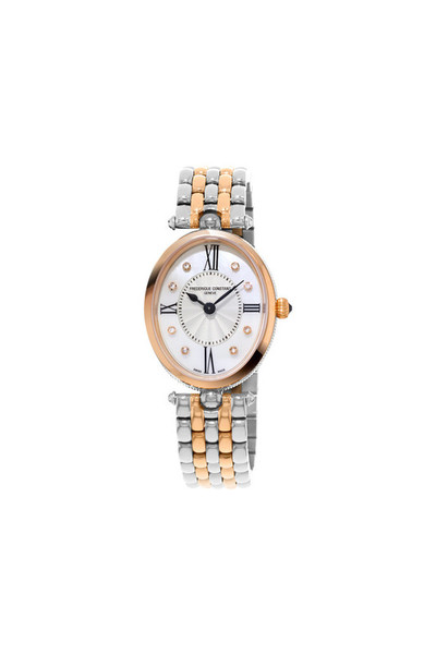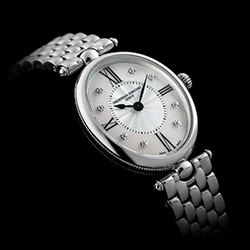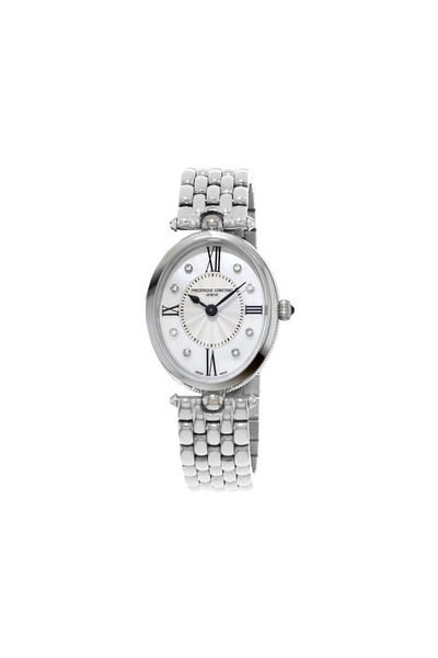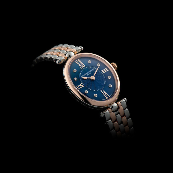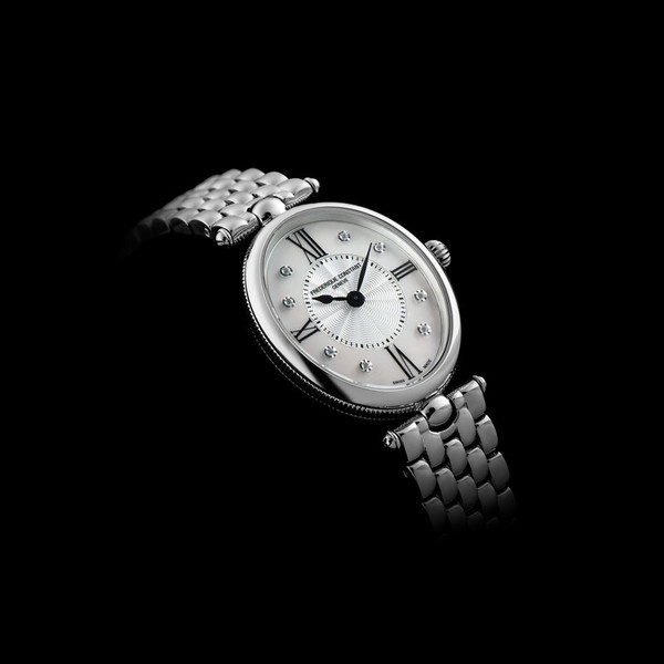 Черпая вдохновение в пышных светских приемах 20-х годов прошлого века, коллекция Art Déco покоряет своей вневременной прелестью и способностью грациозно украсить запястье современной женщины. Frederique Constant продолжает воспевать женственность в классических и неподвластных времени часах с лаконичными деталями, воплощающими изящество и стиль. Гармоничное сочетание современных материалов и винтажной эстетики превращает часы Classics Art Déco в уникальный модный аксессуар. Изысканная овальная форма корпуса подчеркивает эффектные детали на перламутровом циферблате белого или ультрамаринового цвета: гильошированный узор, серебряные или покрытые розовым золотом накладные элементы, черные печатные римские цифры и бриллиантовые метки. Все детали выполнены в винтажном стиле, который вдохновил часовщиков Frederique Constant. Декоративное рифление на торце часового корпуса и сложная геометрия заводной головки, украшенной синим сапфиром, превращают новые часы в идеальный аксессуар на каждый день.