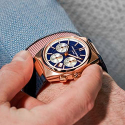 - Версия с розовой позолотой (неограниченная серия) – сочетает роскошный позолоченный корпус с глубоким синим циферблатом, предлагая утонченный и классический стиль.