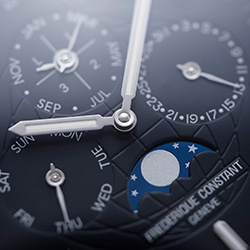 Этот новый циферблат, объединивший оттенки синего, серого и черного цветов, олицетворяет неуловимый сумеречный миг, когда ускользающий дневной свет уступает место звездному небосводу. Вечный календарь позволяет определять не только дни недели, но и фазы Луны. Он дополнен индикаторами даты, месяца и високосных лет, которые умещаются на одном циферблате и обеспечивают простое и интуитивно понятное считывание показаний.