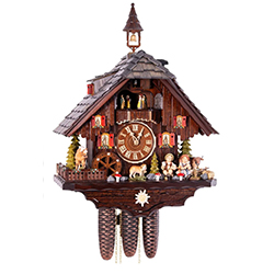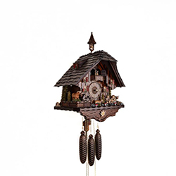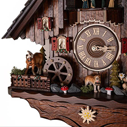 Механизм механический, с цепной тягой и тремя гирями, каждая из которых отвечает за отдельную функцию: движение стрелок, работу кукушки и музыкальный блок. Запас хода — 8 дней. Есть ручное отключение звука.
