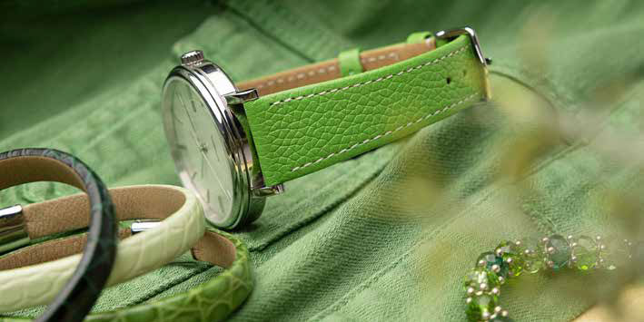 Ремешок изготовлен из глубоко окрашенной в бочке структурированной итальянской телячьей кожи. Этот материал известен своей мягкостью и долговечностью, благодаря чему ремешок сохраняет свой внешний вид и комфорт на протяжении долгого времени.