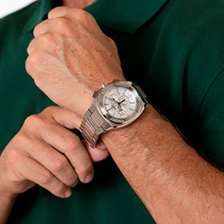Executive Chronograph — это воплощение динамики и изысканности. Корпус из нержавеющей стали с полированными и матовыми поверхностями излучает сдержанную мощь, а циферблат с четкими индексами и люминесцентными стрелками обеспечивает безупречную читаемость. Функция хронографа и окошко даты добавляют практичности, делая часы идеальным спутником для насыщенной жизни. Сапфировое стекло и водонепроницаемость до 100 метров гарантируют долговечность и надежность в любых условиях.