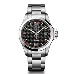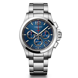 Часы в корпусе из нержавеющей стали выпускаются в трехстрелочном формате с календарем (диаметр 41 и 43 мм), а также в формате хронографа (диаметр 42 и 44 мм). Функции хронографа включают в себя часы, минуты, секунды, 30-минутный счетчик в положении «3 часа», 12-часовой счетчик в положении «9 часов» и центральный 60-секундный счетчик. Корректировка показаний проводится при помощи электронной заводной головки. Индикатор срока службы батарейки (EOL) предупредит о необходимости замены элементов питания. Часы Longines из коллекции Conquest V.H.P. выпускаются в разных дизайнерских решениях: с циферблатами синего, угольно-черного, серебристого и черного оттенков. Финальный штрих придает стальной браслет с надежной складной застежкой.