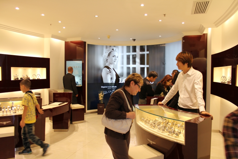 Для нас было странно и то, что luxary бренды соседствуют с совсем демократичными. Так, на главной шопинговой улице может быть Cartier и тут же Tissot, а рядом бренды местного производства. Но для Китая подобные вещи обычны. А так как всем нужно завоевать внимание покупателей, для продвижения активно используют уличные экспозиции. На одном таком стенде была представлена Saint-Imier collection от Longines - можно подойти, рассмотреть, примерить.