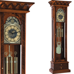 Это традиционные напольные часы в изысканном деревянном корпусе с аппликацией из дерева на сторонах его основания и отдельной дверке. Стекло конической формы позволяет рассмотреть роскошный циферблат с арабскими цифрами и фазой луны, а также гири и латунный маятник в форме лиры.