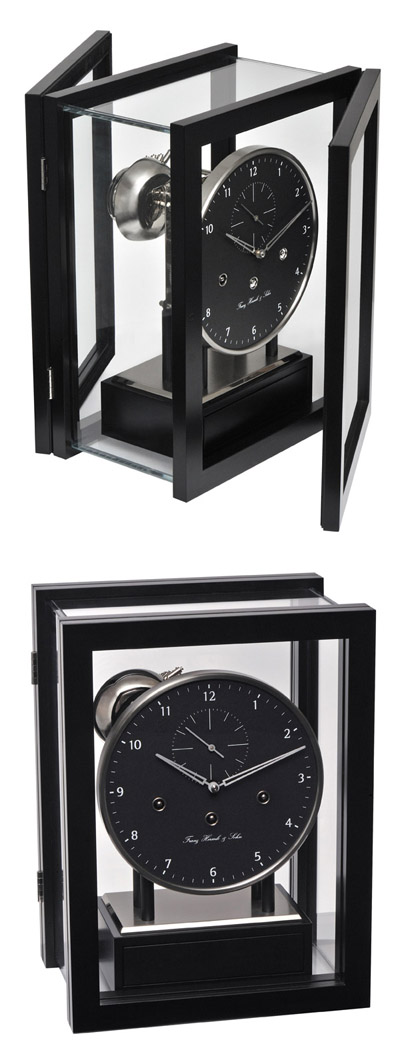 Элегантный тросовый механизм расположен в корпусе из черного лакированного дерева и покрыт кольцеобразным стеклом; в отделке задней стенки используется кап орехового дерева. Часы имеют черный металлический циферблат, хромированные ободок, маятник и встроенный ящик для заводного ключа.