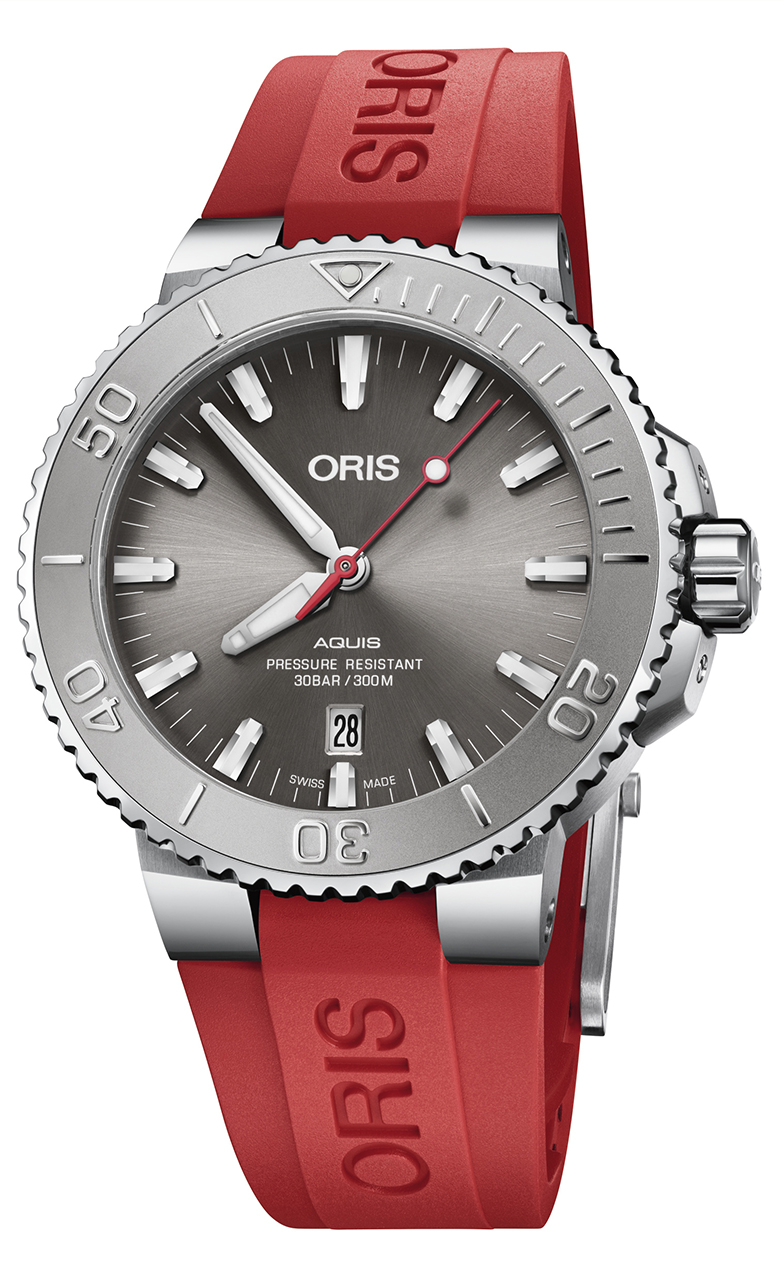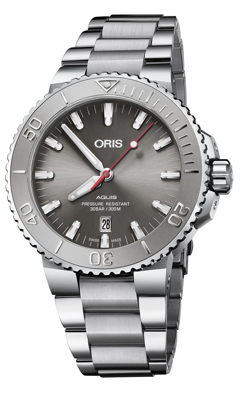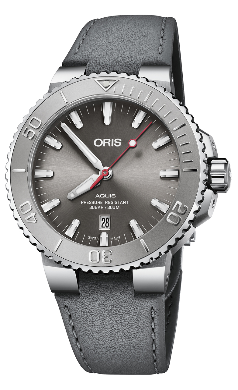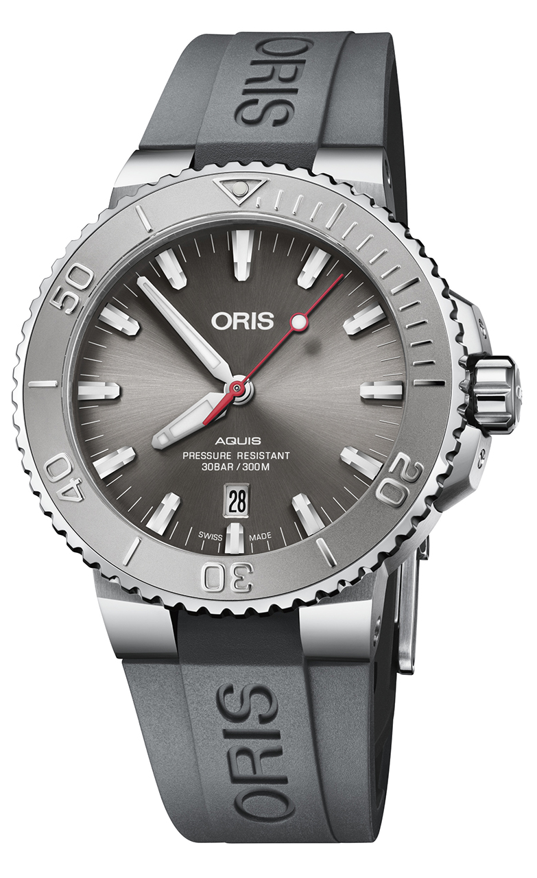 Источником вдохновения в разработке дизайна часов Oris Aquis Date Relief послужил цвет воды и его восприятие. Серый циферблат напоминает цвет штормового моря, а фирменные рельефные маркеры дайверской шкалы окружены фактурной поверхностью как напоминание водной ряби.