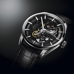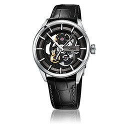 Стальной многокомпонентный корпус, скелетонированный циферблат в тёмно-серых и чёрных тонах. Чёрный кожаный ремешок с раскладывающейся стальной застёжкой.