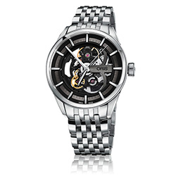 Стальной многокомпонентный корпус, скелетонированный циферблат в тёмно-серых и чёрных тонах. Многорядный браслет из нержавеющей стали с застёжкой «бабочка».