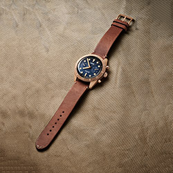 Сбалансированная симметричная структура циферблата, которую традиционно называют «бикомпакс», придает часам вид классического хронографа, дополненного указателем даты в окошке. На дополнительном циферблате в положении «3 часа» находится 30-минутный счетчик хронографа, у «9 часов» – маленькая секундная стрелка. Циферблат темно-синего цвета превосходно сочетается с бронзой корпуса. Такой цвет выбран в качестве напоминания о глубоких водах, в которые Карл Брашир часто и бесстрашно погружался. Креплением часов служит коричневый кожаный ремешок винтажного дизайна.