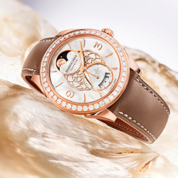 Волшебный блеск перламутра играет главную роль в украшении циферблата модели Tonda Sélène nacre. Корпус этих часов из розового золота также имеет диаметр 36 мм. Безель, инкрустированный 46 бриллиантами чистотой IF и весом 1,8 карата, обрамляет циферблат из белого перламутра с золотыми часовыми отметками. Тонкое золотое кружево в его центре позволяет увидеть невероятные радужные переливы перламутра. Эти часы приводятся в действие калибром PF 318 с автоматическим подзаводом и инерционным грузом из золота и оснащены стрелками в форме листьев с люминесцентным покрытием, указателем фазы Луны у отметки «12 часов» и малой секундной стрелкой у отметки «6 часов». Заводную головку этих часов украшает белый опал огранки кабошон, а светло-бежевый ремешок из телячьей кожи марки Hermès подчеркивает нежные оттенки циферблата новых часов.