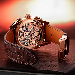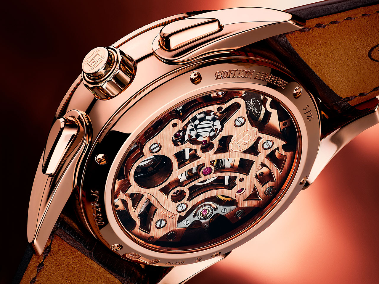 Задумка и разработка этих часов потребовали больших знаний и профессиональных навыков как по части функций, которые необходимо разместить должным образом без ущерба работоспособности, а также по части эстетического исполнения, важного не только для формы, но и для содержимого. Точность в 1/10 секунды и использование пластичного золота для изготовления несущих элементов механизма также относятся к характеристикам, которые по достоинству оценят знатоки часового искусства. Впечатляет и продуманный дизайн. Благодаря ему механизм получился очень надежным и устойчивым к ударам, а также красиво декорированным. Рифленый безель, словно рама, обрамляет пару стрелок на циферблатном «холсте», а завершает роскошную картину ремешок Hermès из кожи аллигатора.