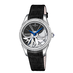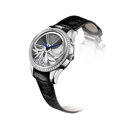 | 3. Модель A2066/4: гравированный циферблат из перламутра антрацитового и белого цвета, оригинальные римские цифры, двойной ротор в форме ажурных лепестков, инкрустированных бриллиантами, безель с бриллиантовой отделкой – 80 бриллиантов (1,02 карата) Top Wesselton, VS1, чёрный ремешок из кожи аллигатора. | |