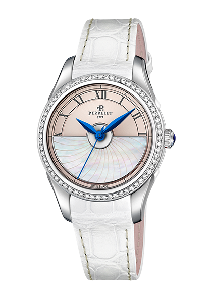 | 1. Модель A2065/4: циферблат из белого перламутра, оригинальные римские цифры, двойной ротор в форме ажурных лепестков с бриллиантовой отделкой – 19 бриллиантов (0,04 карата) Top Wesselton, VS1, белый ремешок из кожи аллигатора. | |