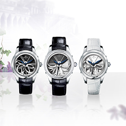 На циферблатах установлены центральные стрелки часов и минут листовидной формы синего цвета, а также тонкая синяя центральная секундная стрелка. Индикация на циферблате представлена римскими цифрами (I-XI) оригинальной формы у первых трёх моделей и чёрными римскими цифрами классической формы у двух последних моделей. Декоративная часть двойного ротора, безусловно, является главным элементом, привлекающим внимание к циферблату. У трёх «цветочных» моделей она инкрустирована бриллиантами, причём у первых двух – имеет одинаковый дизайн. Циферблаты двух последних моделей украшает декоративная часть двойного ротора в форме перламутрового полукруга.