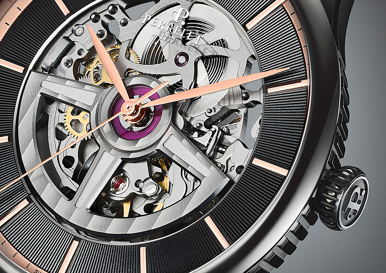 Линии корпуса плавные, с закругленными скошенными ушками с сатинированной поверхностью и контрастным полированным безелем. Матовые и сатинированные каннелюры создают рифление боковой части корпуса, а заводная головка украшена логотипом часового дома Perrelet. Под слегка выпуклым сапфировым стеклом находится скелетонизированный циферблат, благодаря которому просматривается мануфактурный автоматический механизм калибра P-481 с частотой колебаний 28 800 и запасом хода 42 часа.