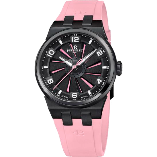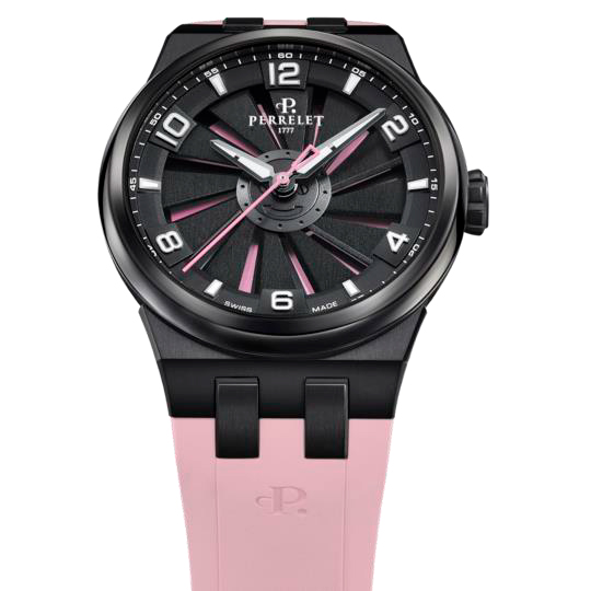 Perrelet Turbine Pink Flamingo — это часы для тех, кто не боится выделяться. Модель сочетает в себе смелый дизайн и высокоточные технологии швейцарского производства. Черный корпус из титана с DLC-покрытием, розовый циферблат, черная турбина из 12 лопастей и розовый каучуковый ремешок — все это создает эффектный образ, который приковывает взгляды.