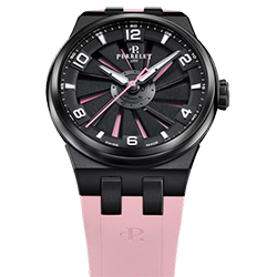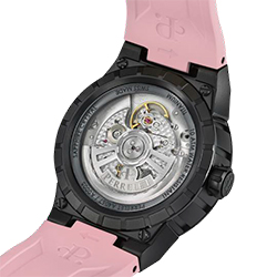 Циферблат с розовым фоном и люминесцентными арабскими цифрами и индексами обеспечивает превосходную читаемость. Турбина при движении создает оптический эффект, завораживающий своей динамикой. Механизм собственного производства P-331-MH, сертифицированный COSC, гарантирует точность и надежность, а запас хода в 42 часа делает эту модель идеальной на каждый день. Прозрачная задняя крышка из сапфирового стекла позволяет заглянуть внутрь и оценить тонкость часового искусства.