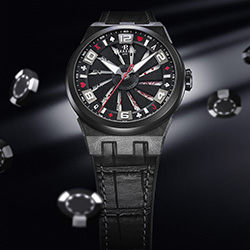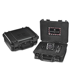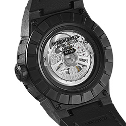 - Корпус: Диаметр 44 мм, центральная часть из поликарбоната и углеродного волокна, желобки, нержавеющая сталь с черным PVD-покрытием на безеле и задней крышке