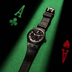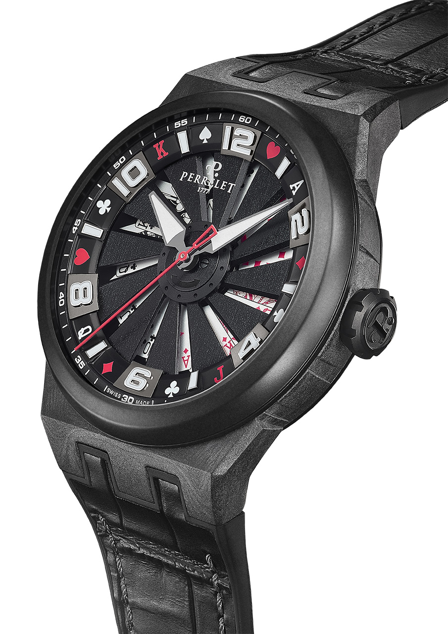 Вращающаяся турбина раскрывает мотив, изображенный на нижнем циферблате: чем быстрее вращение, тем четче иллюстрация. В новой версии часов представлены 12 карт: двойной роял-флеш и пара семерок. Дополнительную отсылку к картам можно увидеть на часовой дорожке: символы четырех мастей и цифры выделяются красным и белым на черном фоне, чередуясь с арабскими цифрами и индексами.
