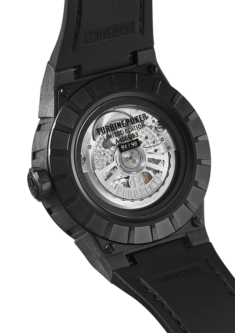 Запатентованная в 2009 году технология Turbine, по которой и названа коллекция, вдохновлена авиационными и морскими силовыми установками. Вращающаяся турбина состоит из 12 лопастей из черного анодированного алюминия и пять противовесов из вольфрама. Сборка устройства требует выверенных компонентов для бесперебойной работы. Вечное вращение турбины, символ Perrelet, оживает на циферблате благодаря мастерству часовщиков компании.