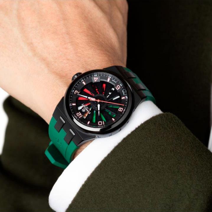 • Циферблат: Черный с лопастями турбины, мексиканским флагом и надписью «Viva México, cabrones!», красные арабские цифры и индексы с белым Super-LumiNova