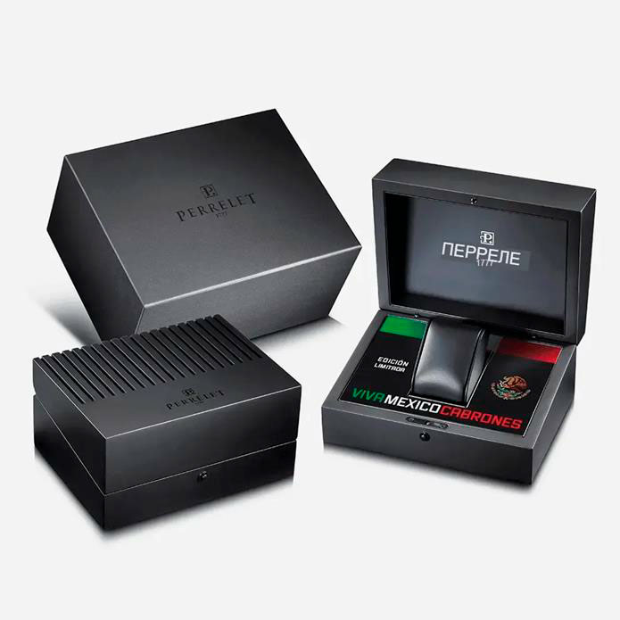 Создание модели «VIVA MÉXICO, CABRONES!» стало результатом глубокого погружения в мексиканскую культуру и историю. Дизайнеры вдохновились патриотическими символами, включая мексиканский флаг и его орла. На циферблате прекрасно отображается этот дух с помощью оригинальной технологии турбины, состоящей из 12 черных анодированных алюминиевых лопастей, которые вращаются при движении запястья. Логотип Perrelet и яркие элементы в красном и зеленом цветах создают эффектный контраст, символизируя флаг страны.
