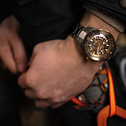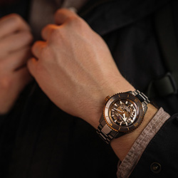 Корпус из плазменной керамики Captain Cook, выполненный в стиле хай-тек, сочетает в себе его сверхпрочность поверхности и загадочные глубокие антрацитовые оттенки с новым вариантом часов skeleton. Модель имеет браслет из плазменной керамики в стиле хай-тек с рядом звеньев более светлого оттенка по центру.