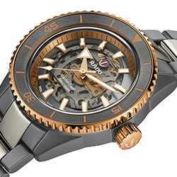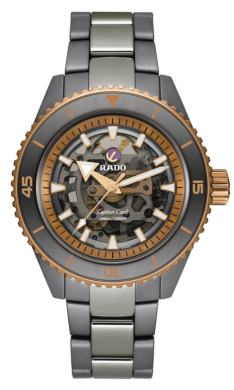 Модель Captain Cook расширяет линейку часов новым броским дизайном skeleton, который демонстрирует инновационный механизм R808, чудо контрастов, ноу-хау и продуманную геометрию. Впервые представленный в различных вариантах отделки и моделях Captain Cook, R808 теперь является заголовком серии Rado «Искусство скелетонирования». Имеет со вкусом подобранные варианты отделки, придающие различным линейкам продуктов, в которых он представлен, особый коллекционный вид.