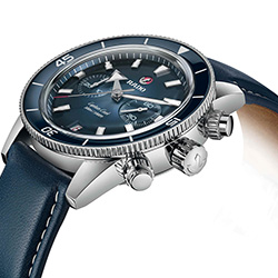 Новая модель Captain Cook Chronograph оснащена выразительным сапфировым стеклом формы box-shaped, устойчивым к появлению царапин с двусторонним антибликовым покрытием. Более тонкий, комфортный и стильный корпус диаметром 43 мм из полированной нержавеющей стали или бронзы с круговой полировкой на выбор оснащен вставкой из высокотехнологичной керамики синего или черного цвета на безеле, прекрасно сочетающейся с цветом окантовки и циферблата соответствующей модели. Циферблат представлен в трех цветовых вариантах – градиент от серебристого к синему, от серебристого к черному или покрытие синего цвета с узором «солнечные лучи». Накладные деления, метки и цифры покрыты Super LumiNova® для еще лучшей видимости даже в условиях плохой освещенности. Стрелки также покрыты Super LumiNova® – в частности, массивная часовая стрелка со стрелообразным наконечником, прямая минутная стрелка, а также секундная стрелка хронографа с наконечником красного цвета гарантируют вам точность показаний независимо от времени суток и локации. Неотъемлемая деталь — символ движущегося якоря цвета родия на пластине красного цвета этих прочных и надежных часов, которые теперь также оснащены циферблатом хронографа на 9-часовом делении, стандартным секундным циферблатом на 3-часовом делении и окошком даты на 6-часовом делении. Дата, как и в предыдущих моделях, отображается в красном цвете на серебристом фоне. Внутри часов установлен более тонкий автоматический часовой механизм калибра R801 с 37 камнями, пятью стрелками и запасом хода 59 часов. Часы оснащены антимагнитной пружиной NivachronTM и отрегулированы в пяти положениях. Водонепроницаемость до 30 бар гарантирована за счет завинчивающейся заводной головки и утопленных кнопок.