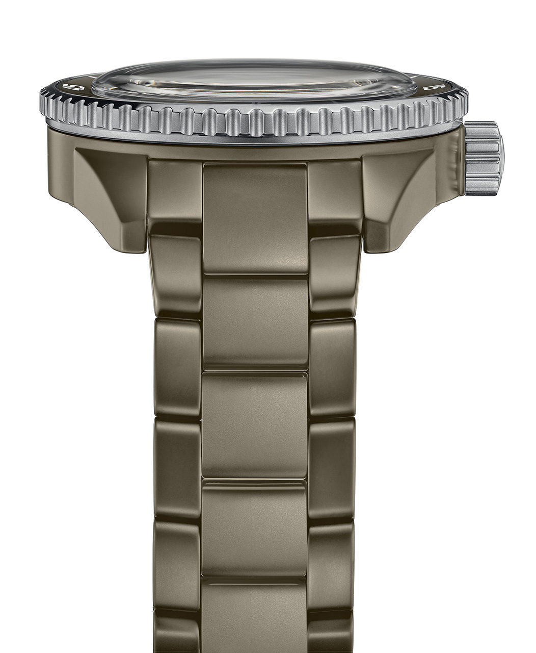 - Корпус-моноблок из матовой плазменной высокотехнологичной керамики оливкового цвета. Вращающийся безель из закаленной матовой нержавеющей стали со вставкой из матовой высокотехнологичной керамики оливково-зеленого цвета и гравированными цифрами, метками и треугольником с покрытием Super LumiNova® белого цвета.