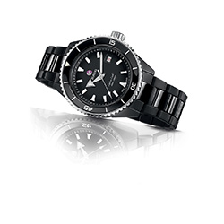 - Вращающийся безель из закаленной нержавеющей стали со вставкой из полированной высокотехнологичной керамики черного цвета и выгравированными цифрами, метками и треугольником с покрытием Super LumiNova® белого цвета.