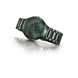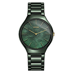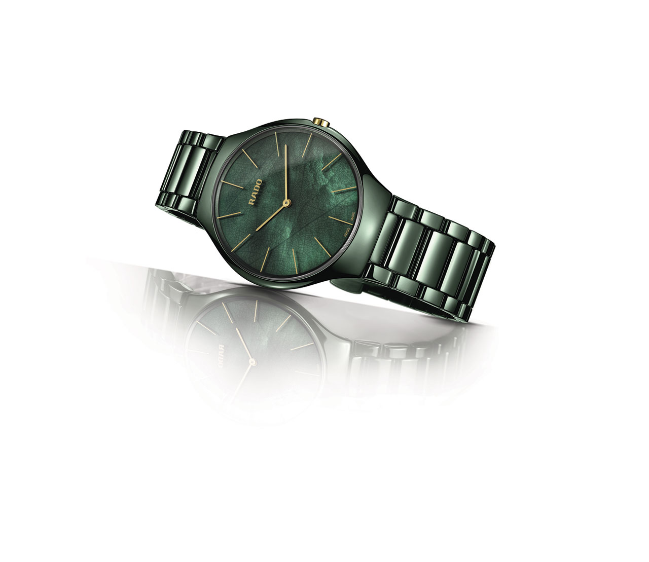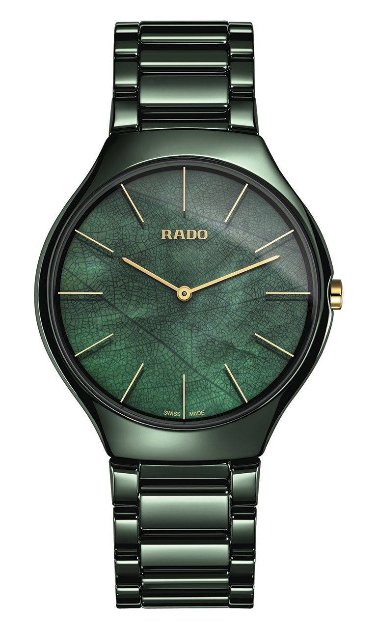 Эти яркие зеленые часы с уникальными и органичными деталями появились вслед за успешной коллекцией True Thinline от Rado из высокотехнологичной керамики в четырех цветах, представленной в прошлом году. Циферблат в цвет корпуса изготовлен из зеленого перламутра с утонченным узором структуры листка, отпечатанным с обратной стороны. Золотистые металлизированные указатели нанесены на сапфировое стекло. Тем самым создается эффект, будто они парят над циферблатом. Выполненные в глянцевой зеленой керамике, эти наручные часы в яркой тематике природы привлекают внимание и создают настроение.