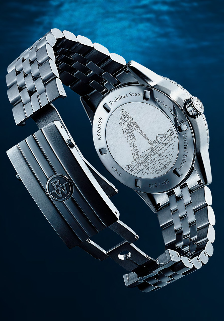 Корпус часов оснащен завинчивающейся задней крышкой, на которой выгравировано изображение Фонтана Же-д’О, знаменитой женевской достопримечательности. Часы представлены на пятирядном браслете из нержавеющей стали и оснащены раскладывающейся застежкой с двойной системой безопасности.