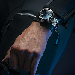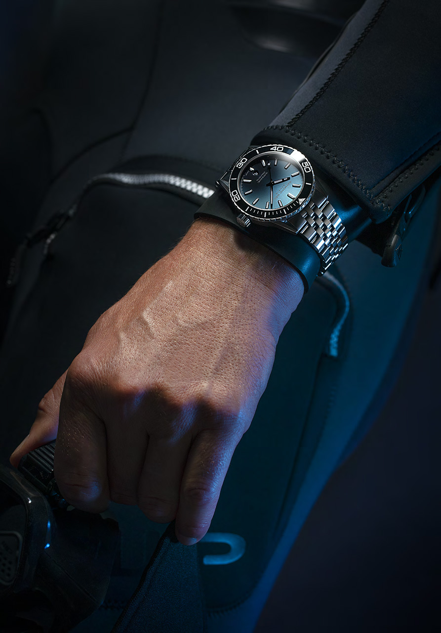 Модель freelancer diver (ограниченная серия Женева) с синим градиентным циферблатом отдает дань уважения озеру Леман. Верхняя часть циферблата выполнена в светлых оттенках синего цвета, которые плавно переходят в темно-синие в районе «6 часов», что является визуальной метафорой самых глубоких и темных частей озера.