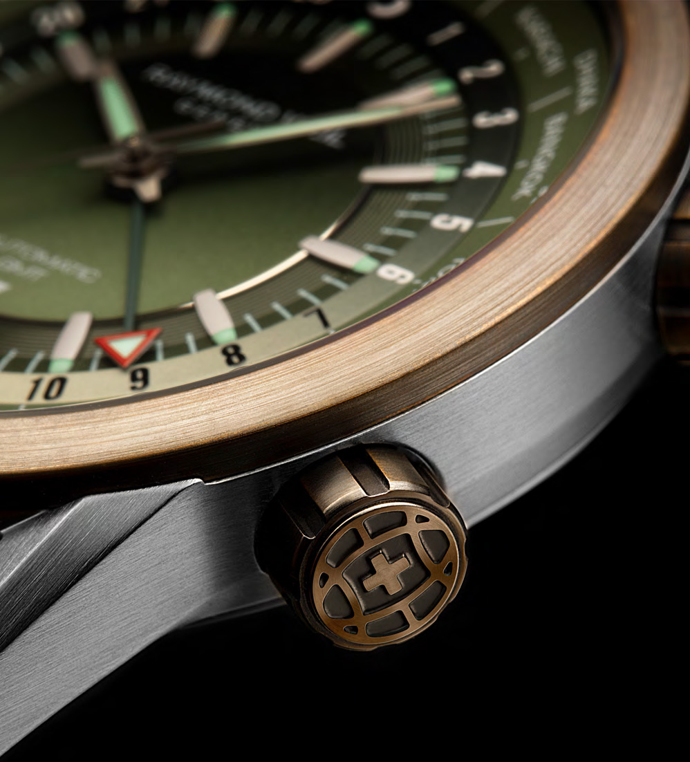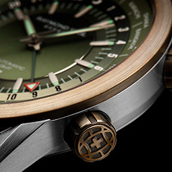 Модель freelancer GMT Worldtimer представлена в двух вариантах: с черным и зеленым циферблатом. Черный циферблат перекликается с корпусом из нержавеющей стали с черным DLC-покрытием – оттенок, который демонстрирует сдержанный характер и при этом выглядит очень изысканно. Вариант с зеленым циферблатом имеет корпус из нержавеющей стали и сочетается с бронзовым безелем и двумя бронзовыми заводными головками. Бронза – интересный сплав, который со временем приобретает привлекательную патину. Эта модель с оттенками хаки и бронзовыми акцентами являет собой стильный образец военного шика и делает ее идеальными часами для любителей приключений.