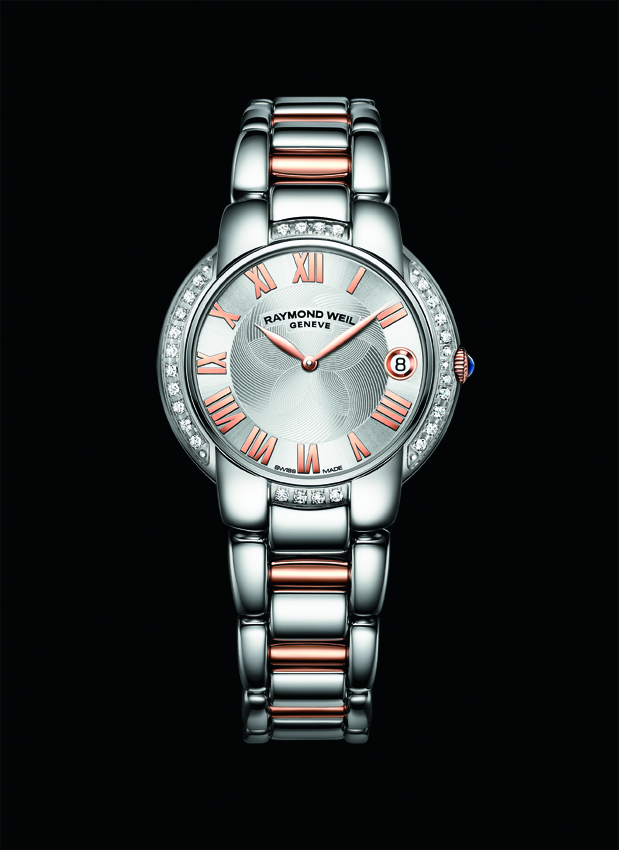Серебристый циферблат новых часов выполнен в технике «гильоше», его украшает изображение цветка жасмина и надпись в виде арки «Raymond Weil Genève» с плавными очертаниями. На циферблате находятся центральные стрелки часов и минут листовидной формы, окошко даты с ободком из розового золота на отметке «3 часа» и полный набор римских цифр. Красоту циферблата бережно укрывает сияющее сапфировое стекло нежного голубого цвета с изображением короны.