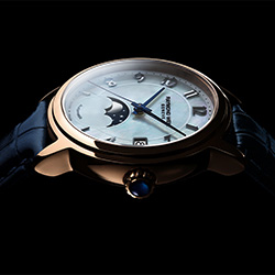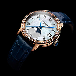 Поддайтесь соблазну мягких изгибов новых часов Maestro Ladies. Чистота перламутра и аккуратная апертура фазы луны создают идеальную гармонию между элегантностью, изысканностью и новаторством. Насыщенный темно-синий ремешок из телячьей кожи с тиснением под кожу аллигатора навевает мысли о чарующем ночном небе.
