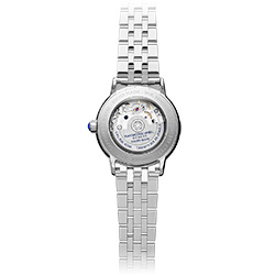 Благодаря сверкающему ореолу из 62 бриллиантов в корпусе диаметром 34 мм из нержавеющей стали с PVD-покрытием из розового золота на Maestro Ladies невозможно не обратить внимание. На белом перламутровом циферблате изящно расположились арабские цифры и небольшое окошко даты в положении «на 3 часа», а контрастные синие стрелки подчеркивают элегантность исполнения этой модели.