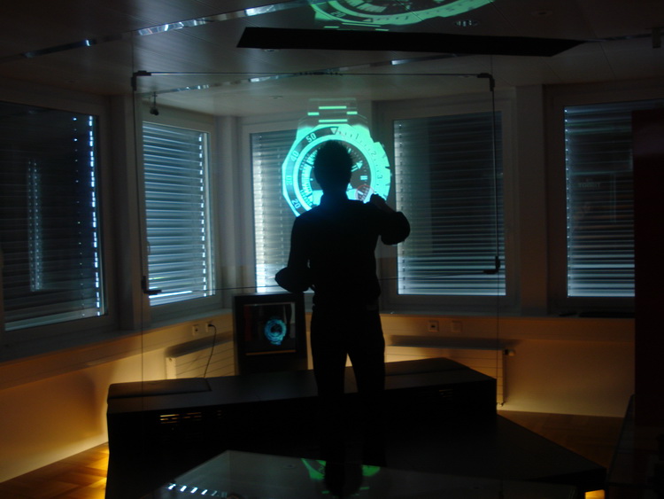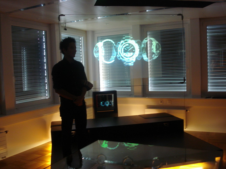 Во-вторых, доску можно использовать и для "примерки" новинок. Вот как это происходит. На руке у техника обычная "бумажная" модель. Вы надеваете ее на руку, подносите к экрану, выбирается модель - любую! - и нажимается на клавишу. В итоге модель полностью, включая объем, проецируется на экране: вы видите себя как в зеркале - с новой моделью часов, вы можете оценить, как эта модель выглядит со стороны и подходит ли она вам. Отличный способ выбрать подходящую модель из тех, которых еще нет в городе и проверить, как одна и та же модель будет смотреться на разных запястьях.