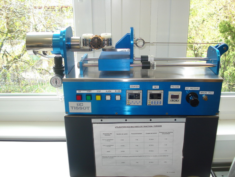 Ремешки проверяют еще и на износ трением: вот аппарат, на котором лежит ремешок и подвижная часть его трет. Если ремешок кожаный, то его дополнительно еще и поливают водой - если на коже появляются трещины или она теряет цвет, то Tissot выбраковывает всю партию! Следующий прибор работает только ночью, потому что на нем проверяют противоударные часы: часы складывают в железную коробку и взбалтывают 10 000 раз (очень шумно!).