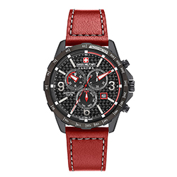 | 1. Swiss Military Hanowa Ace Chrono 6-4251.13.007: стальной корпус с чёрным PVD-покрытием, чёрно-серый циферблат, красный ремешок. | |