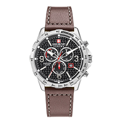 | 2. Swiss Military Hanowa Ace Chrono 6-4251.04.007: стальной полированный корпус, чёрно-серый циферблат, коричневый ремешок. | |