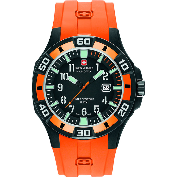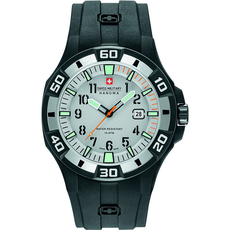 На выполненном в тактическом стиле циферблате светло-серого, песочного или чёрного цвета расположены центральные широкие наполовину скелетонированные стрелки часов и минут, тонкая (синяя, красная, белая или оранжевая) секундная стрелка, белые условные часовые индексы, трафаретные арабские цифры (1,2,4,5,6,7,8,9,10) белого или чёрного цвета и окошко даты на отметке «3 часа». Часовая и минутная стрелки, а также условные индексы и цифры обработаны люминесцентным составом. На циферблате также имеются: логотип марки в виде швейцарского белого креста на красном фоне (на отметке «12 часов») и надписи: «Swiss Military Hanowa – Water Resistant 10 Atm – Swiss Made».