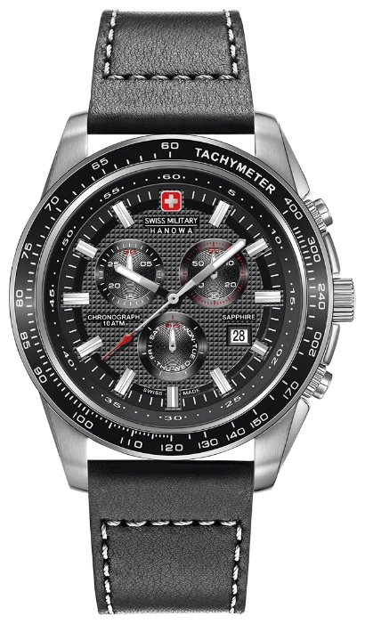 | 4. Swiss Military Hanowa Crusader Chrono 6-4225.04.007: корпус из нержавеющей стали 316L, безель с ионным покрытием чёрного цвета и тахиметрической шкалой, чёрно-серый циферблат с часовыми индексами серого цвета, серый кожаный ремешок с белой прострочкой. | |